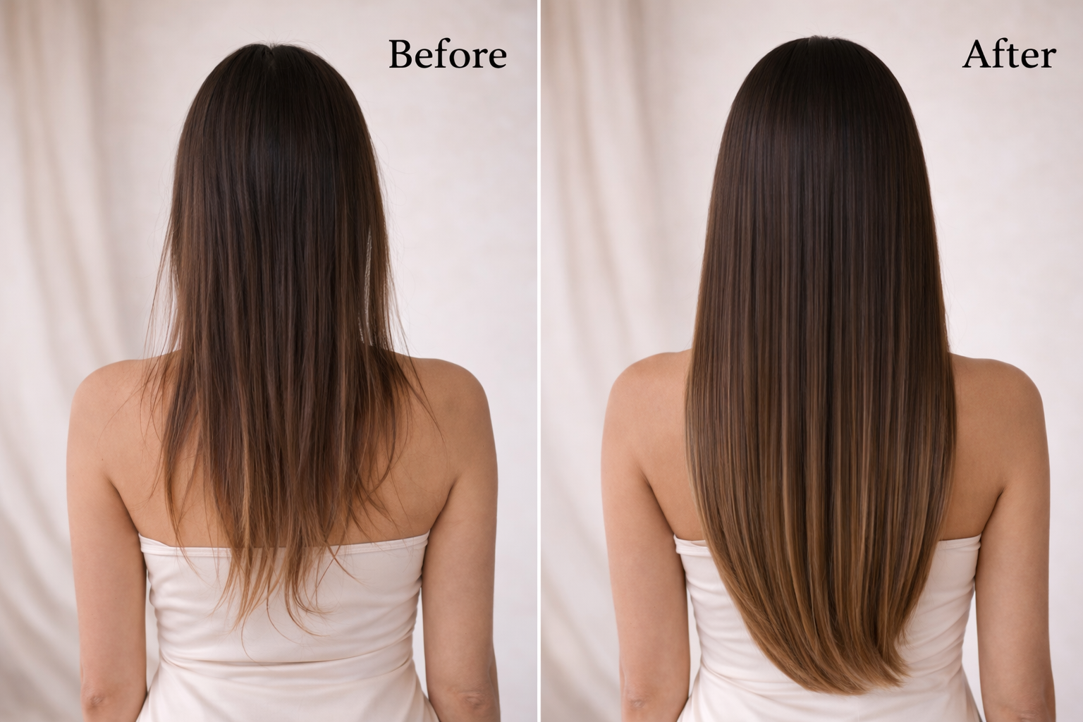 Geen zichtbare overgangen, wél meer volume en lengte — volledig afgestemd op jouw haar en uitstraling, zodat jij je zelfverzekerd en mooi voelt